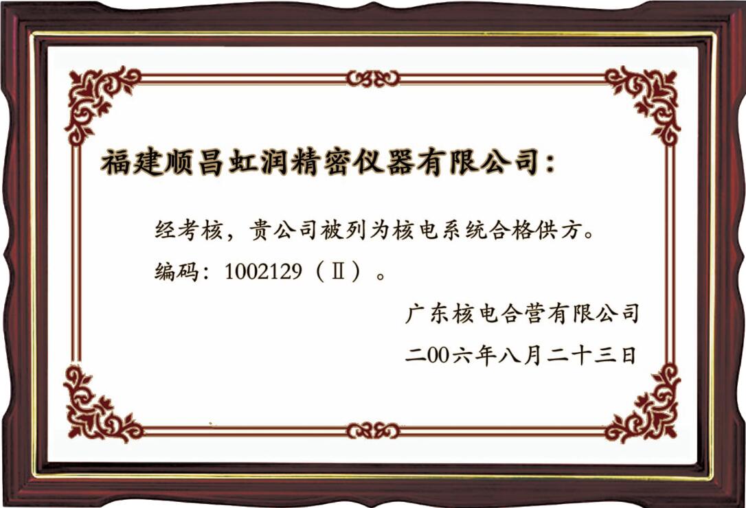 “核電系統(tǒng)合格供應(yīng)方”的要求極為嚴(yán)格,虹潤公司憑借品牌的優(yōu)勢、高性能的產(chǎn)品、規(guī)范的管理以及優(yōu)良的資產(chǎn)得到了中國核工業(yè)集團(tuán)公司、廣東核電合營有限公司的認(rèn)可。作為秦山核電站、大亞灣核電站、嶺澳核電站的合格供方,不僅大大增強了虹潤品牌的知名度,也極大提高了虹潤儀表的市場競爭力。