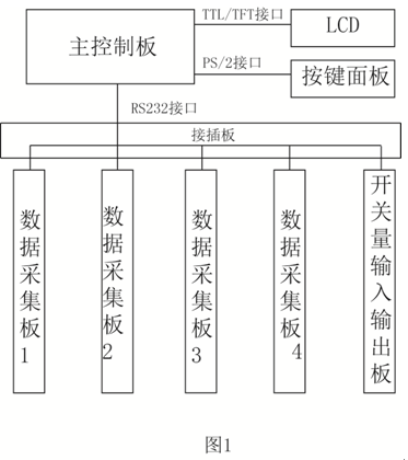 觸摸式無紙記錄儀主要由主板、按鍵板、數(shù)據(jù)采集板、開關(guān)量輸入、輸出板、液晶屏、觸摸屏、液晶驅(qū)動板、電源板、轉(zhuǎn)接公共板等組成。按鍵面板通過PS/2接口與主板連接,LCD通過TFT接口與主板連接,主板的RS232接口連接到轉(zhuǎn)接板,再通過轉(zhuǎn)接板和各采集板和開關(guān)量輸入輸出板連接,構(gòu)成了多個RS232通信電路。