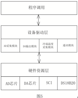 采集板數(shù)據(jù)驅(qū)動程序包括AD采集模塊、DA輸出模塊、冷端采集模塊、通訊模塊等,不同的模塊在程序中有各自的頭文件和源文件,采用模塊化結(jié)構(gòu)的模塊可以提高代碼的重用率,只要修改少量代碼就可以完成程序的移植,在程序中只需要調(diào)用各公共的接口函數(shù)就能對設(shè)備進行操作,這樣一來系統(tǒng)軟件的層次分明,便于維護和調(diào)試。