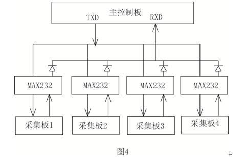主控制板與采集板之間的通信電路采用主從總線拓撲結(jié)構(gòu),以主控制板為主機,采集板為從機,每塊采集板的通信接口與RS232芯片連接,為防止輸出端電平相互影響,在從機的發(fā)送端和主機的接收端之間串入一個二極管。為保證機和從機正常的傳送數(shù)據(jù),需要有一套完整的信息傳輸模式,數(shù)據(jù)格式以及內(nèi)容的規(guī)約協(xié)議。主機向所有從機發(fā)送帶地址信息的指令報文,被尋址從機根據(jù)指令報文中功能碼做出應(yīng)答或動作,每個從機都有各自的獨立的地址,主機向從機發(fā)送的各種指令報文和從機所發(fā)的報文都是以從機的地址為開頭的,從機只讀取發(fā)給自己的指令,對以其它從機開頭的報文不做應(yīng)答。