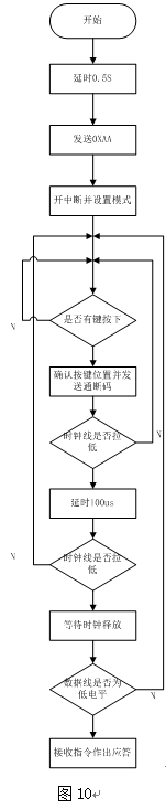按鍵延遲0.5S后向主板發(fā)送0XAA通知主板。開總中斷、外部中斷,設(shè)置中斷觸發(fā)模式,將時鐘線、數(shù)據(jù)線連在微處理器的中斷引腳上,掃描鍵盤,看是否有按鍵按下,確定按鍵的位置,發(fā)送相應(yīng)的碼。判斷時鐘線是否為低電平,如是則延時100US再判斷時鐘線是否為低,等待時鐘釋放,再看數(shù)據(jù)線是否為低,為低則表明主板在請求發(fā)送數(shù)據(jù),根據(jù)主板發(fā)來的指令作出相應(yīng)的應(yīng)答和動作。