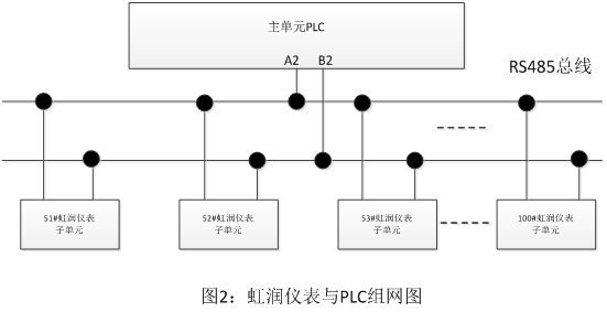 考慮到100臺(tái)儀表在RS485總線上的實(shí)時(shí)性、有效性、正確性,現(xiàn)將100臺(tái)虹潤(rùn)NHR系列智能控制儀表通訊組網(wǎng)分為兩條總線,分別由PLC的串口擴(kuò)展口分別定義為A1、B1和A2、B2 ;下面是虹潤(rùn)NHR系列智能控制儀表與PLC主機(jī)連接圖,見圖1、圖2: