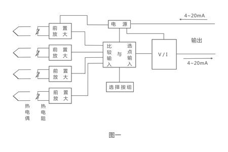 NHR-XTRM系列溫度遠(yuǎn)傳監(jiān)測儀是二線制多回路溫度變送器。它可接受多點(diǎn)熱電阻信號(hào),并將各種生產(chǎn)過程中固體、液體、氣體的溫度顯示和 變送遠(yuǎn)傳。該儀表安裝在被測對(duì)象附近,用屏蔽電纜將各回路的熱電阻的測溫信號(hào)連至該 儀表各自獨(dú)立的前置放大器,前置放大器將微弱變化信號(hào)放大處理,輸送到比較輸入電路(選擇高溫信號(hào))或選點(diǎn)輸入電路,進(jìn)行信號(hào)選擇。被選中的回路信號(hào),再經(jīng)過電壓/電流轉(zhuǎn)換單元處理,將前置放大器的輸出電壓轉(zhuǎn)換成DC 4~20mA電流信號(hào)輸出。如選擇測溫范圍0~150℃則對(duì)應(yīng)DC 4~20mA輸出。 具體原理見圖一所示。