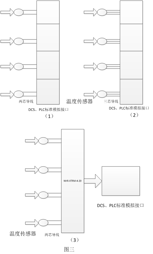 方案一:如圖三(1)所示,每個(gè)熱電阻傳感器配置一個(gè)二線制溫度變送器,分別用二芯屏蔽電纜引至計(jì)算機(jī)標(biāo)準(zhǔn)模擬接口,在中央控 制室監(jiān)控。