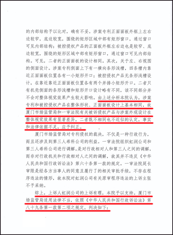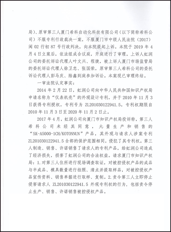 2015年9月福建順昌虹潤(rùn)精密儀器有限公司(以下簡(jiǎn)稱虹潤(rùn)公司)在市場(chǎng)上發(fā)現(xiàn)廈門??谱詣?dòng)化科技有限公司(以下簡(jiǎn)稱希科公司)未經(jīng)虹潤(rùn)公司同意,大量生產(chǎn)和銷售仿冒虹潤(rùn)NHR-8000系列無紙記錄儀的侵權(quán)產(chǎn)品希科A5000、A6000無紙記錄儀。侵犯了虹潤(rùn)公司的知識(shí)產(chǎn)權(quán)。虹潤(rùn)公司于2016年先發(fā)函告知希科公司中止侵權(quán)行為,但希科公司不予理會(huì)。為了維護(hù)自身的合法權(quán)益,虹潤(rùn)公司又向廈門市市場(chǎng)監(jiān)督管理局(原廈門市知識(shí)產(chǎn)權(quán)局)申請(qǐng)行政處理,后再提起行政訴訟。2019年7月30日,福建省高級(jí)人民法院作出【2019】閩行終302號(hào)行政判決書,認(rèn)定??乒旧a(chǎn)的產(chǎn)品與我司的“儀表機(jī)殼”外觀設(shè)計(jì)專利整體形狀、正面面板設(shè)計(jì)上基本相同。至此,虹潤(rùn)公司歷時(shí)四年的維權(quán)行為得到了法律支持,福建省高院終審認(rèn)定廈門??茻o紙記錄儀專利侵權(quán)。